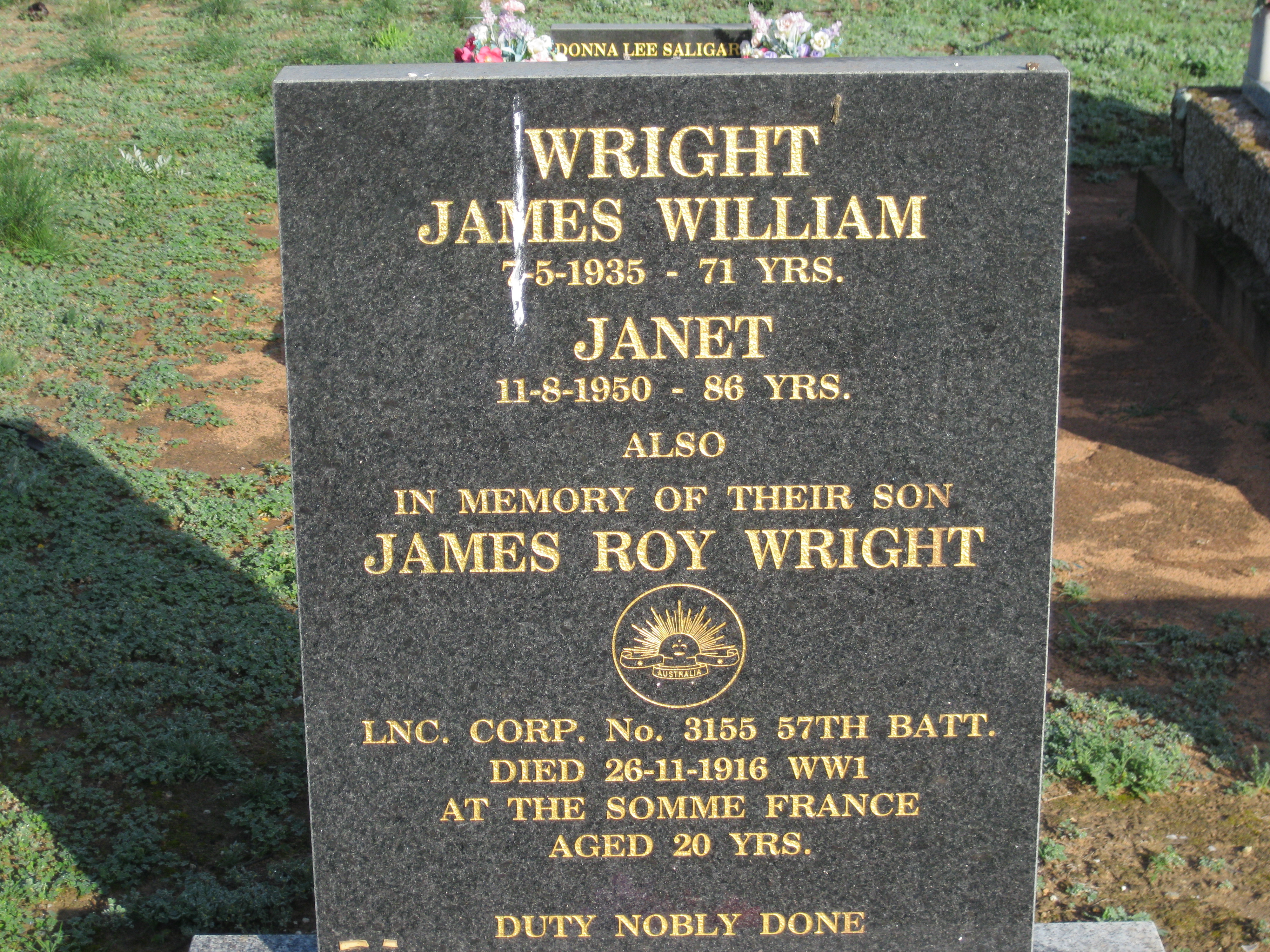 | Miscellaneous information from cemetery records | Commemorated in Lake Boga Cemetery, Victoria. Photo: Peter Dennis. Parents: James and Janet WRIGHT |